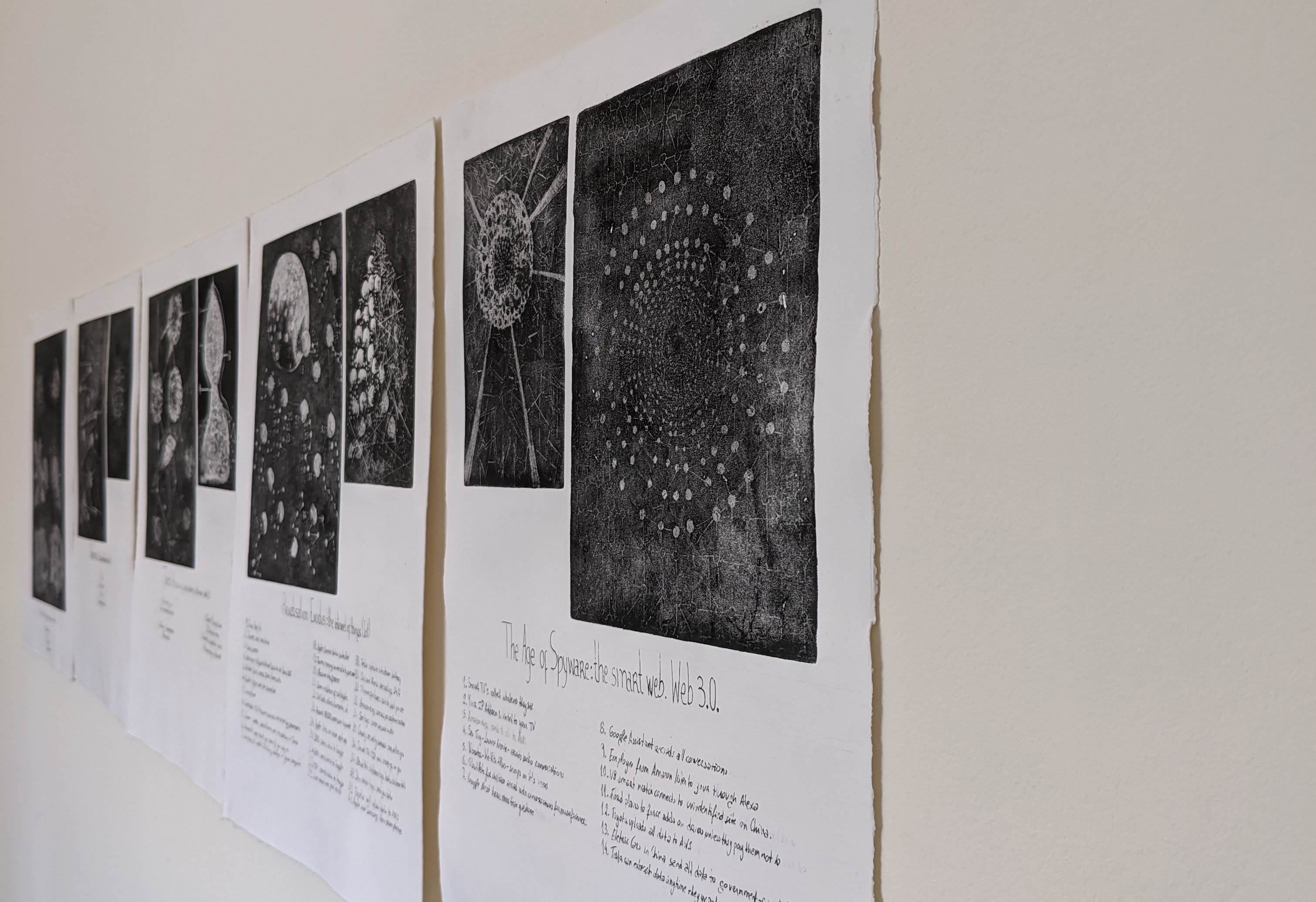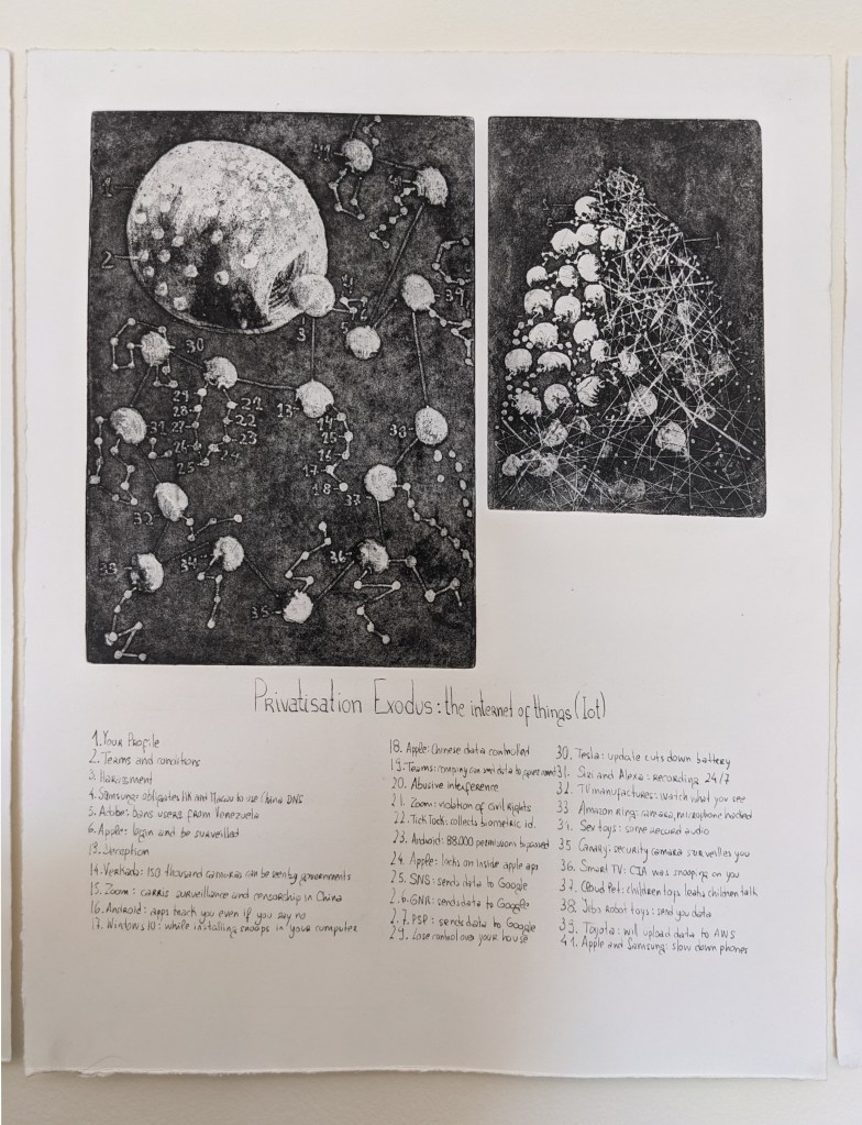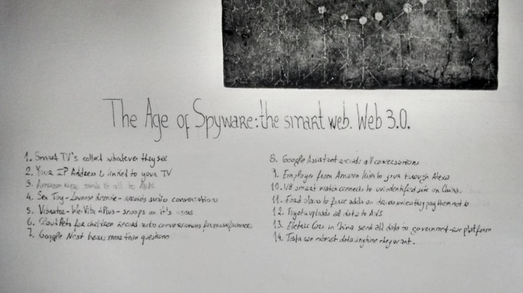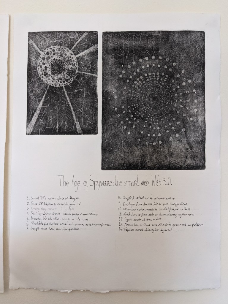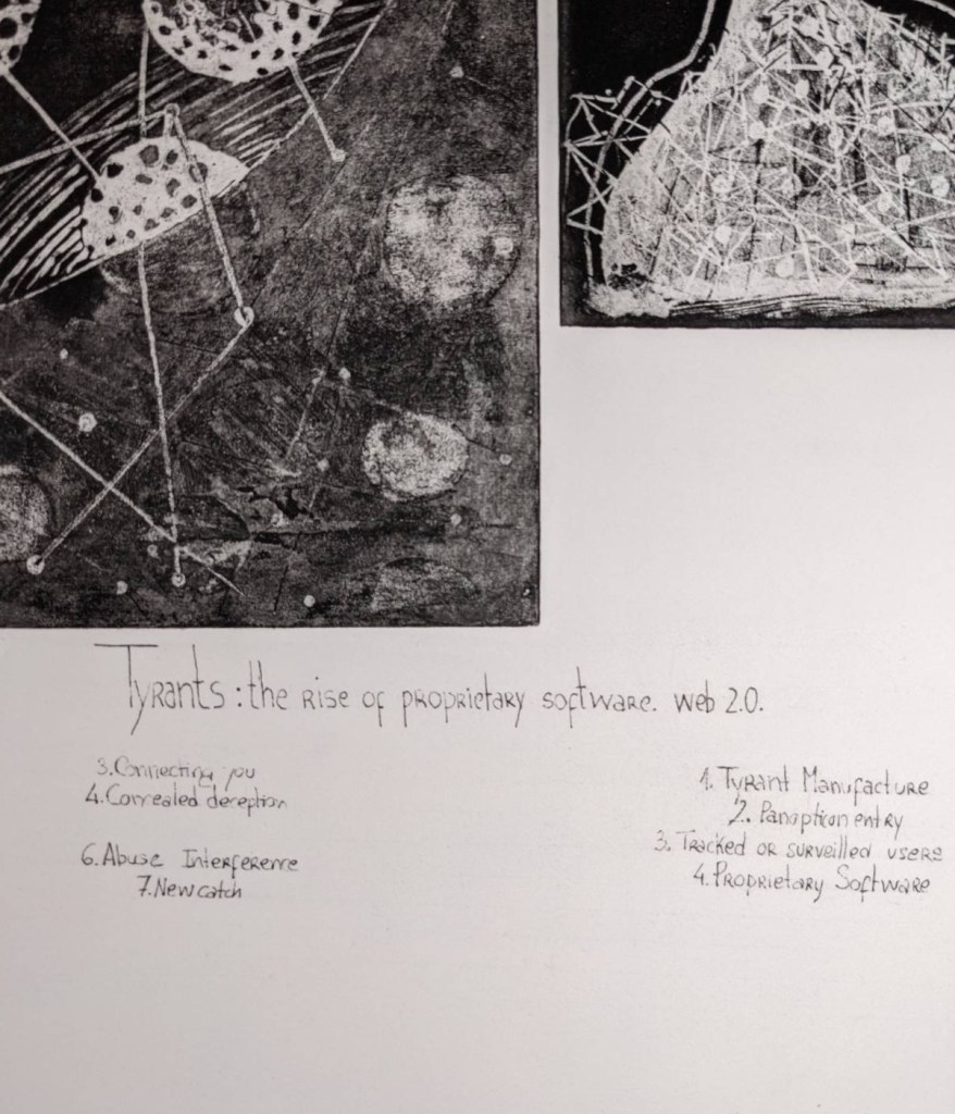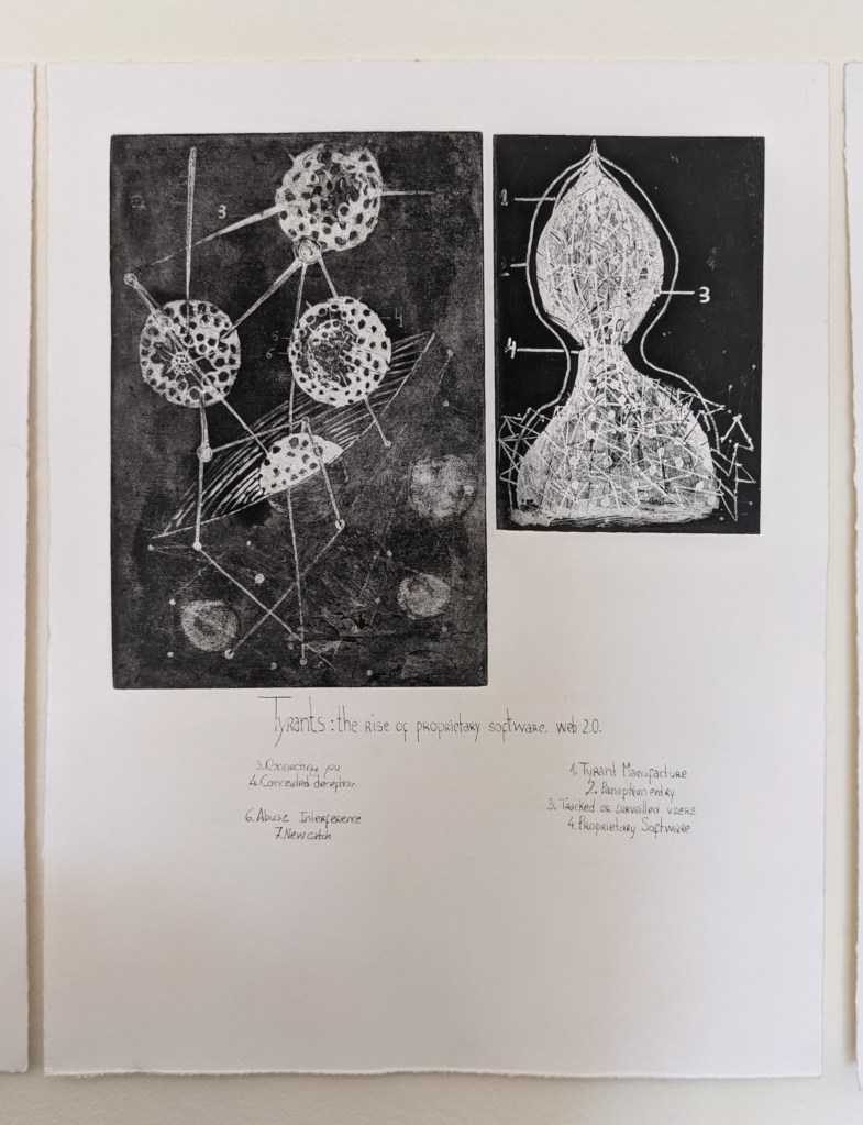 The series of etchings above, documents the other side of the coin, a transparent representation of the well known surveillance apparatus, the new social media model as brought us: from surveillance to violation of human rights.