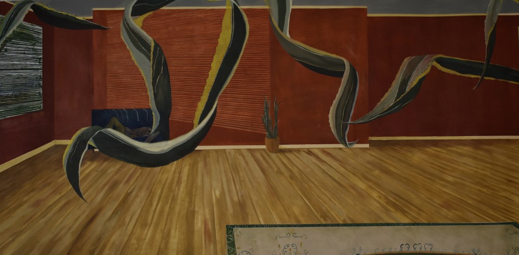 Though these tree paintings, we can read a sequence, the spaces are getting darker as our future is more bleak than ever. An intrusive light guides our eyes though the interiors that are getting more and more consumed by nature. Most notoriously on “Nature III”, the pallet of colour withstands this flow, more brown, red and blue tones evoking this destruction and melting of human and nature worlds together. Aiming to represent the power and necessity of nature and the urgency to nourish it.